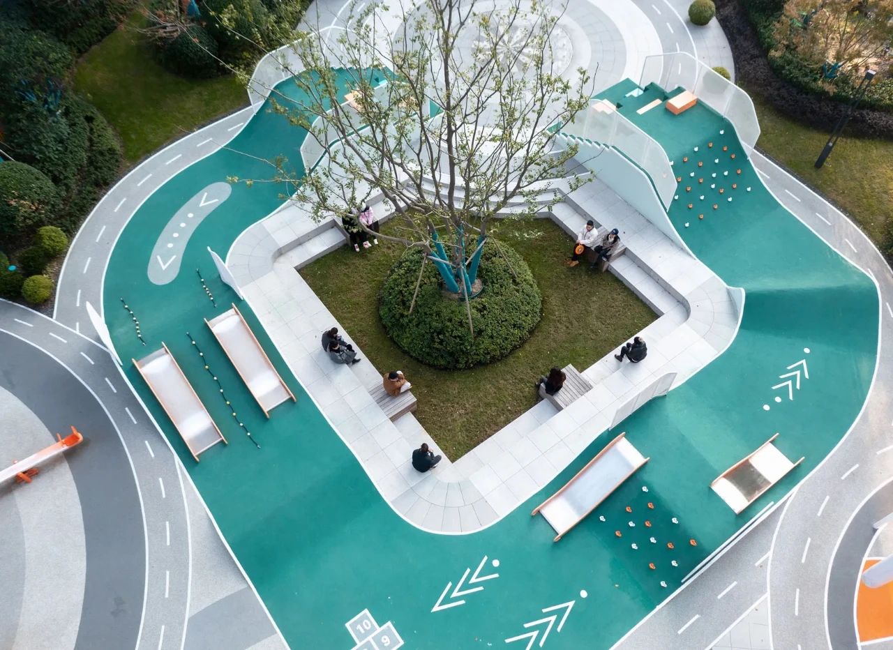 此外,馬字周圍的空白空間也豐富了游玩動(dòng)線,包括不同的休閑迷你廣場(chǎng),以下沉式廣場(chǎng)的形式構(gòu)成座位功能,為兒童和成人提供遮蔭區(qū)域,以及為年輕人和青少年提供的運(yùn)動(dòng)區(qū)或?yàn)閮和峁┑牡孛嬗螒?,將空間轉(zhuǎn)換為多功能的全民廣場(chǎng)。